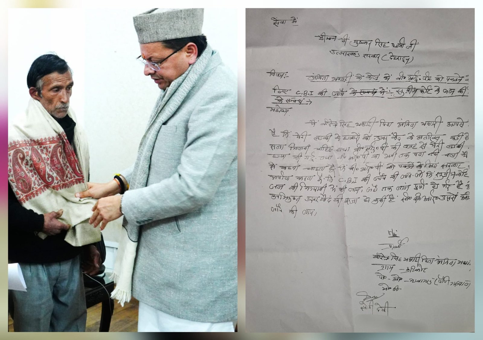 अंकिता भंडारी हत्याकांड मामले में अंकिता के माता-पिता ने सीएम को सौंपा पत्र,सीएम को दिए पत्र में अंकिता के माता-पिता ने CBI जांच की मांग की।