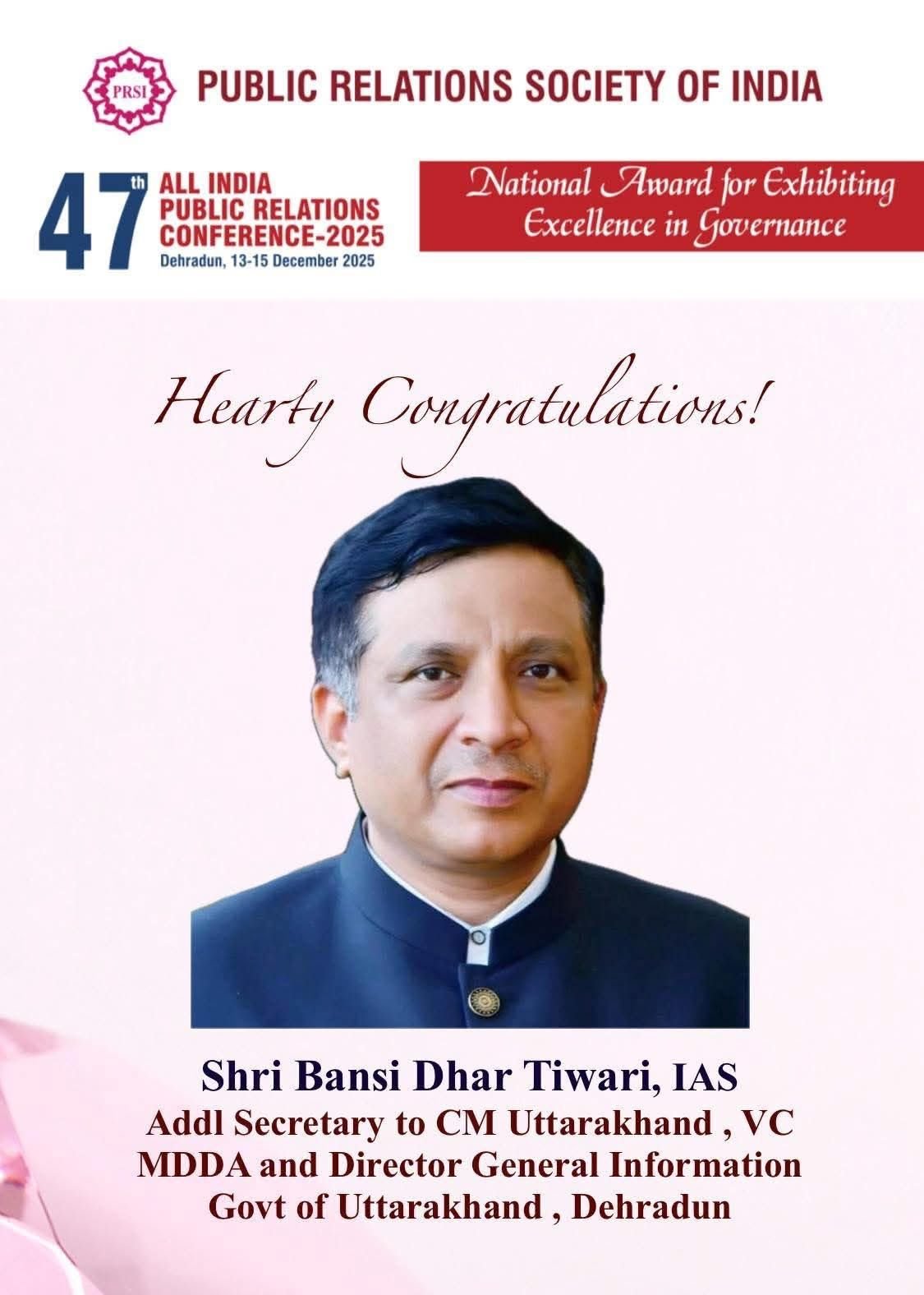उत्तराखंड के लिए आज का दिन अत्यंत सम्मानजनक साबित हुआ है। मुख्यमंत्री के अपर सचिव एवं सूचना महानिदेशक IAS बंशीधर तिवारी को सुशासन के क्षेत्र में उत्कृष्ट कार्य के लिए राष्ट्रीय पुरस्कार प्रदान किया गया है।