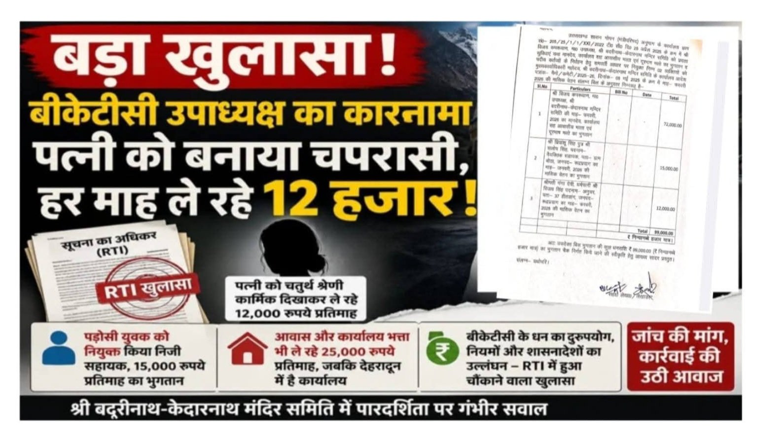 बद्री-केदार मंदिर समिति के उपाध्यक्ष ने अपनी पत्नी को बनाया चपरासी, RTI में हुआ खुलासा।
