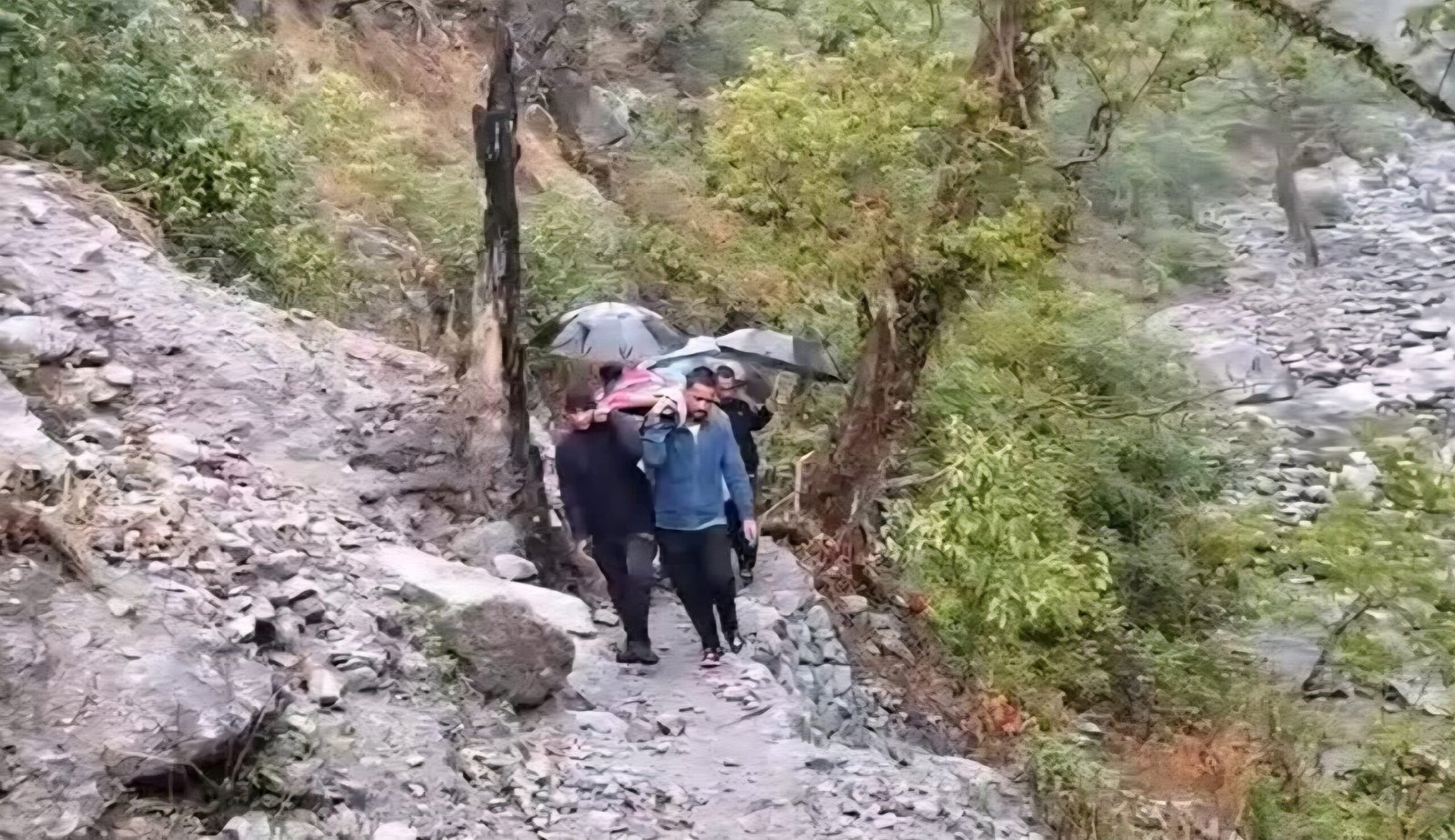 पहाड़ की पीड़ा! गर्भवती को डोली में लेकर पांच घंटे पैदल चले ग्रामीण,बारिश में भी भीगती रही प्रसूता।
