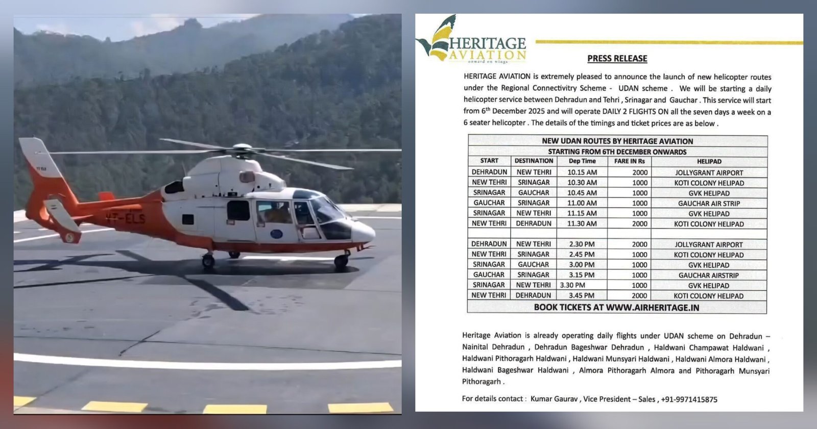 एक बार फिर देहरादून से गोचर चमोली तक टिहरी,श्रीनगर उड़ान योजना के तहत हेरिटेज एविएशन (HERITAGE AVIATION) की हेली सेवा कल 6 दिसंबर से शुरू हो रही है। लंबे समय से बंद होने से इमरजेंसी जाने वालों को दिक्कत का सामना करना पड़ रहा था सेवा फिर शुरू होने से लोगों को आसान यात्रा ओर सस्ते में हवाई सेवा का अवसर मिलेगा खासकर इमरजेंसी में जाने वालों के लिए बहुत ही फायदेमंद प्रतिदिन दो बार सुबह और शाम में हेली सेवा चलेगी।टिकट बुक करने के लिए BOOK TICKETS AT WWW.AIRHERITAGE.IN साईट पर जाकर कर सकते हैं।